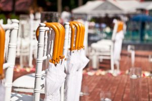 Malheureusement, Dame Nature peut avoir prévu autre chose ! Par conséquent, planifiez un plan de secours à l’avance pour ne pas être pris au dépourvu si la pluie ou des fortes chaleurs décidaient de s’inviter. Lors d’un mariage extérieur, un chapiteau est souvent privilégié pour y tenir la réception, mais il peut aussi être utilisé pour la cérémonie en cas de mauvais temps. Pour profiter à fond de votre mariage et ne pas être exténué en milieu d’après midi à cause de la chaleur :