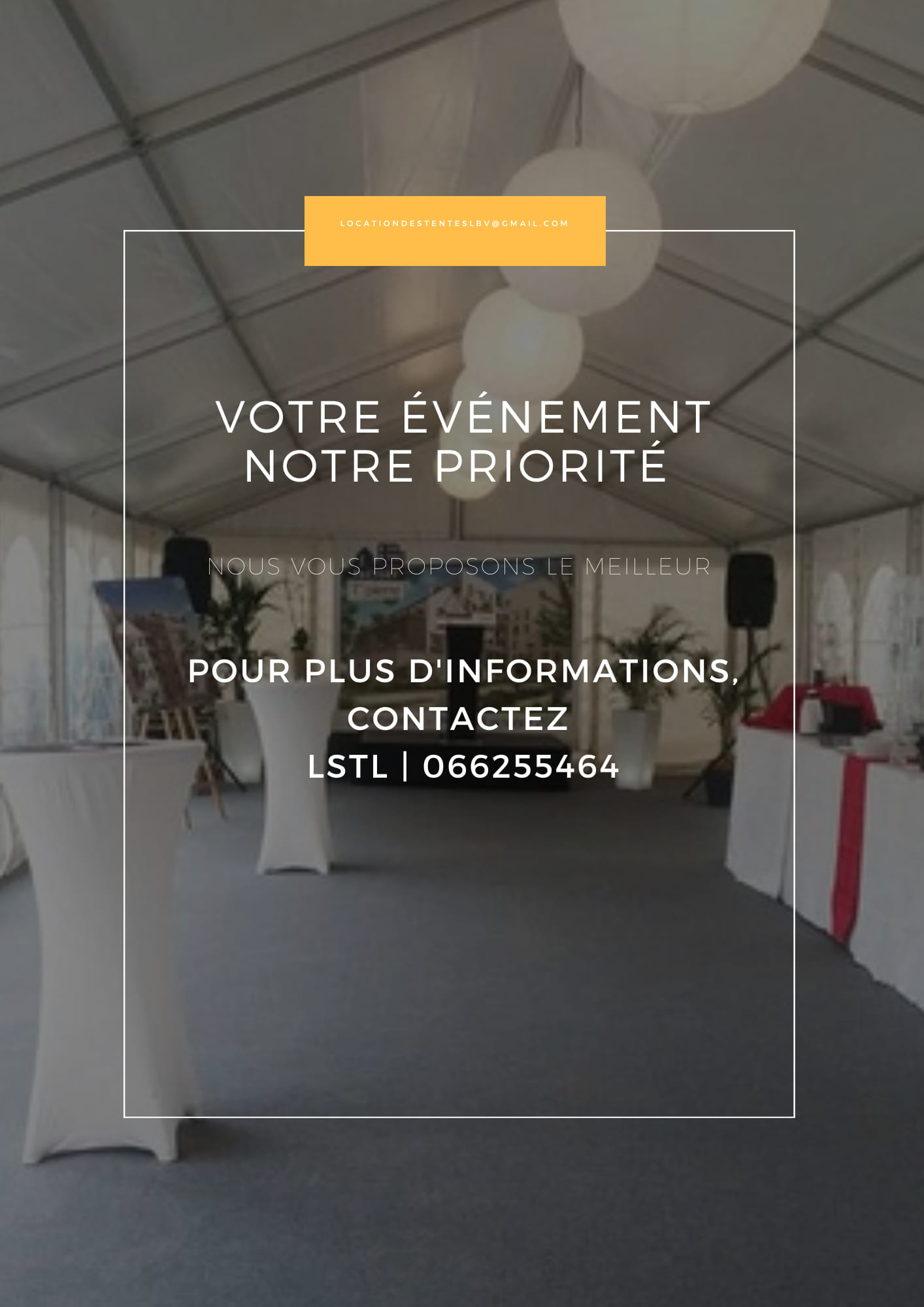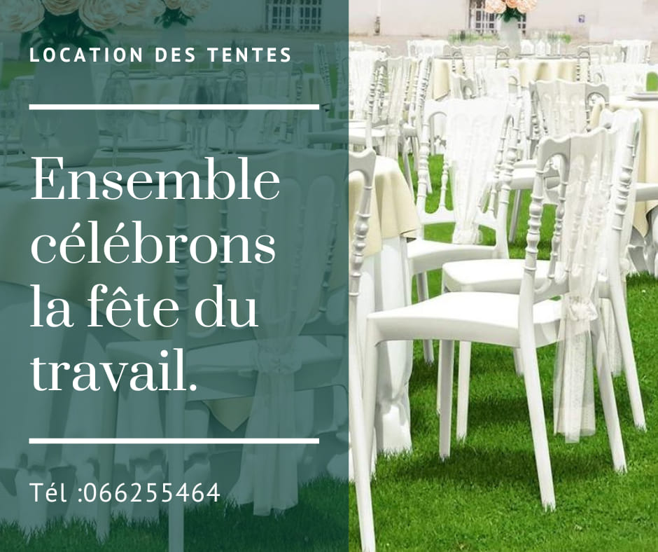 LSTL vous propose tout ce dont vous avez besoin pour vos évènements en terme de location du matériel à savoir :Tente simple ,Tente VIP,Tente climatisée, Tente de 6m 8m 12m propre et en bonne état. Chaises plastiques et VIP des tables de 10,des tréteaux de 1,5m à 2,5m ,du gazon artificiel etc…. Nous faisons des locations en urgence également. PS:le montage et le démontage de chaque tente est gratuit .