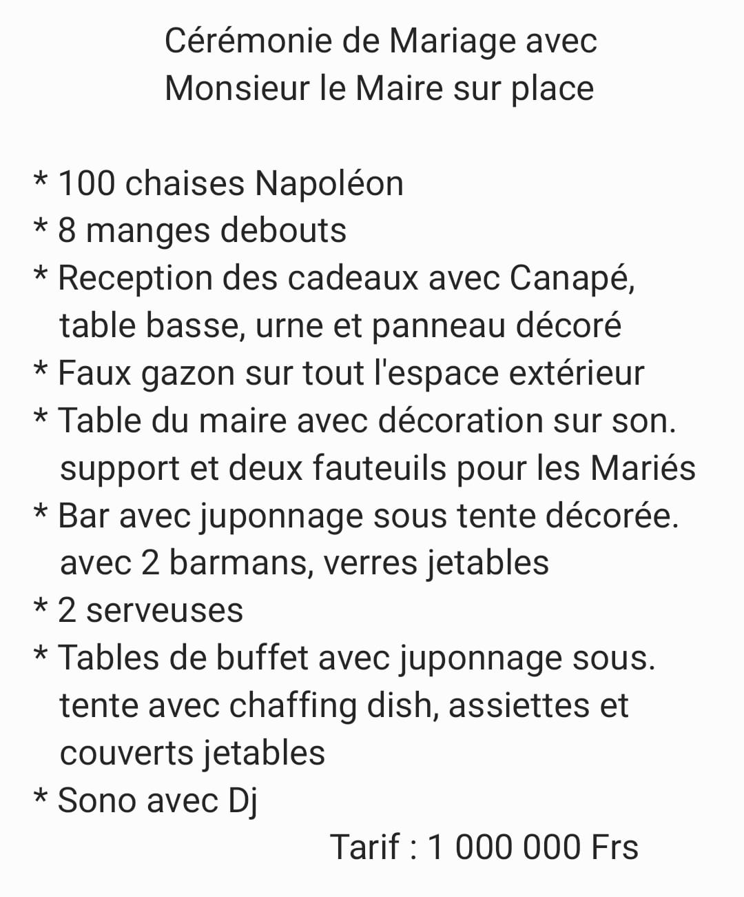 TARIF : 1 600 000 Frs = 150 Invités