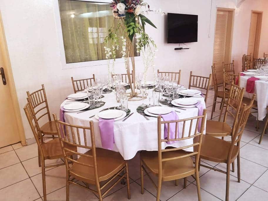 Nous proposons un cocktail de bienvenue, une entrée un plat (au choix parmi différents menus), un dessert (au choix), la salle décorée et le service tout au long de la soirée